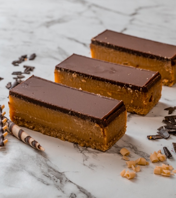 Soft, moist and rich caramel on a crumbly biscuit base, topped with chocolate.