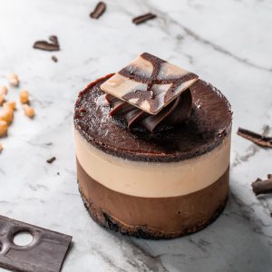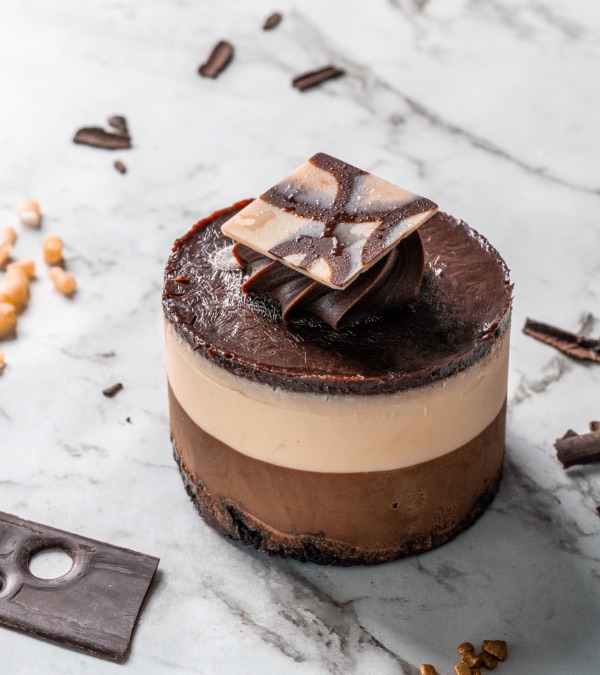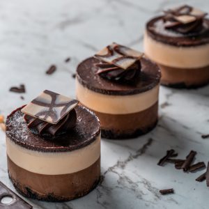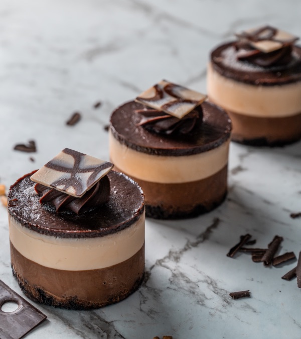 Dark & White chocolate mousse layers topped with dark chocolate sauce.
