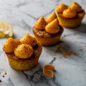 A satisfyingly dense slice of gluten free lemon cake with poppy seeds.