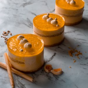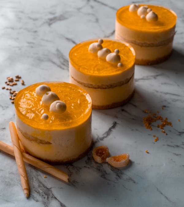 A crunchy gluteen free biscuit base, mango compote topping and delicious, creamy mousse.